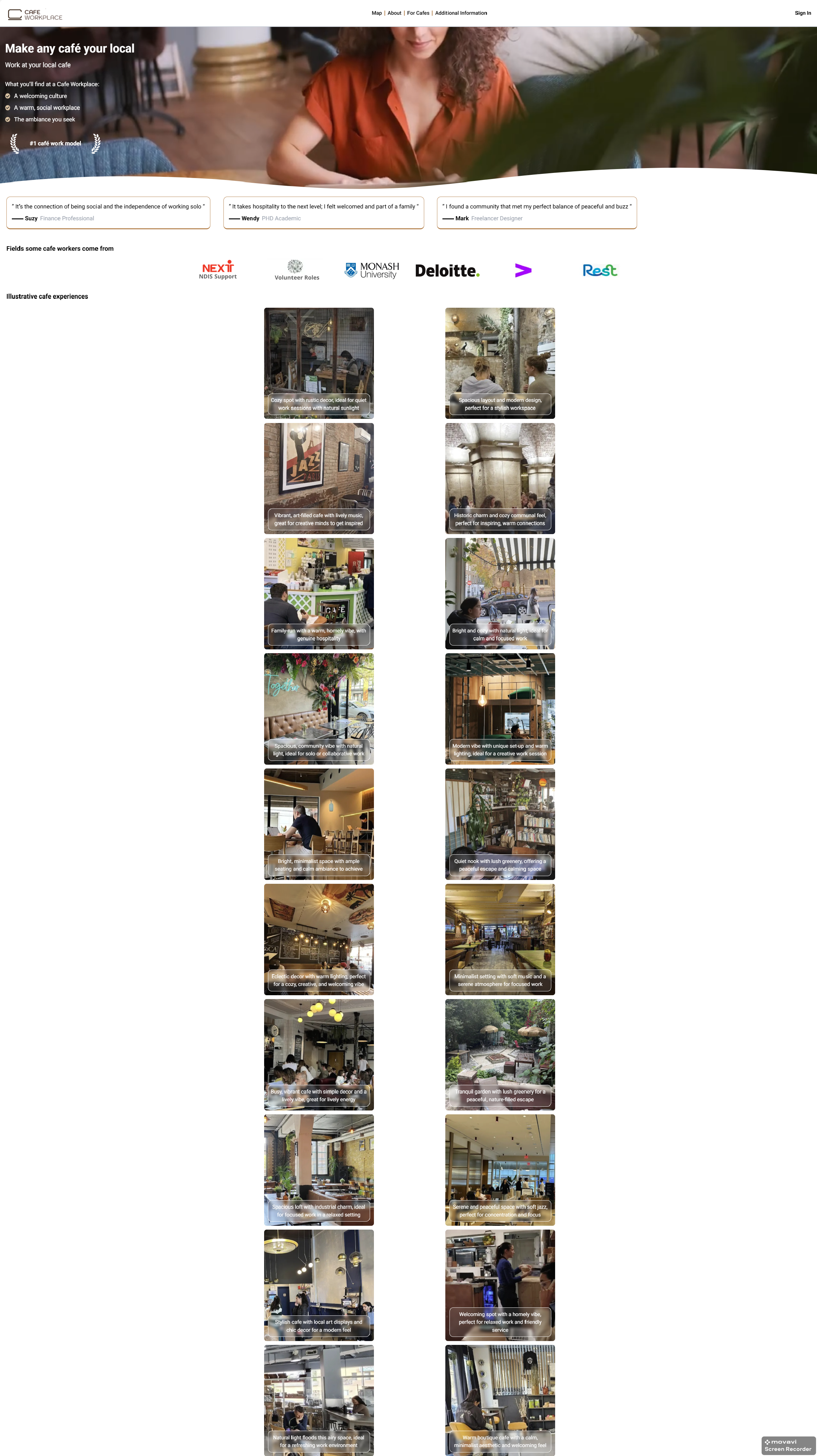 Building the website for CafeWorkplace involved creating a collaborative, modern space where individuals and businesses could easily discover and book coworking spaces. The design was focused on clean aesthetics, smooth navigation, and a seamless booking system, making it simple for users to explore available spaces and book a spot without any technical headaches. We worked closely with the CafeWorkplace team to ensure the website was easy to maintain, so they could easily update space availability and pricing as needed. The result is a dynamic, professional platform that not only attracts clients but also supports the growth of their coworking community.